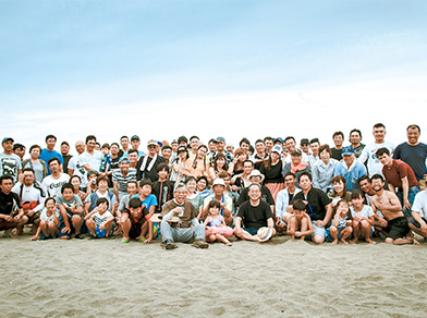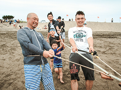 社員とその家族、協力業者さんも参加する地引網。チームワークの良さは、遊びにも発揮されます。
